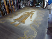 | ・彫り進んだ型、紗貼りです | ・黄から差して行きます | ・摺り込み終了 | ・ヤット、紗貼り出来ます | |||