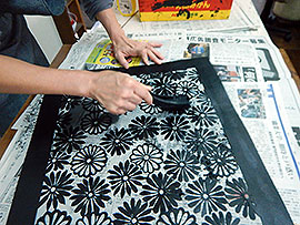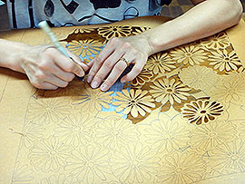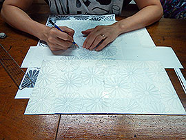 | ・事前にデザインデータをお送りいただいていましたが、当日相談しながら柄を決める事にしました。 北さんは、菊紋の連続。坂さんはシリアル柄、松さんは線が広がるイメージで進めます。 各自、下絵から型へ写す事から始めます。 |