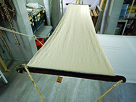 | ・紗の目の点検。目詰まりを修正します。 | ・紗貼り。地白は紗の伸びなど気を使います。 | ・広幅の型付け。横に3リピートになります。 | ||