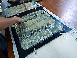| ・リピートに気をつけて型付けです。 | ・クッション型も紗貼りします。 | ・シリアスの染液を2色作ります。 | ||