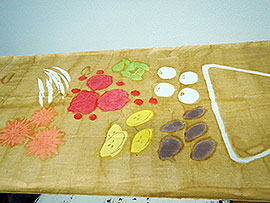 | ・型付け終了。 | ・壁掛け、クッション、共に型付けました。 | ・差し刷毛で染液を差して行きます。 | ||