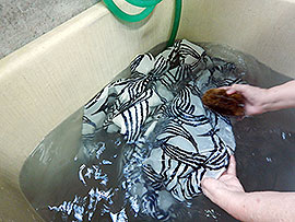 | ・地色を冷染で染めて、フィックスで完成です。 | ・蒸しが済んで、水元。 | ・蒸しが済んで、ざっと水洗いで完成です。 | ||