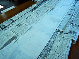| ・小幅のセンター、しごきます。 | ・あいだに新聞紙をいれて3つにたたみます。 | |