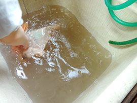 | ・広幅、色止めが済んで水元します。 | ・蒸しが済んで水元します。 | |