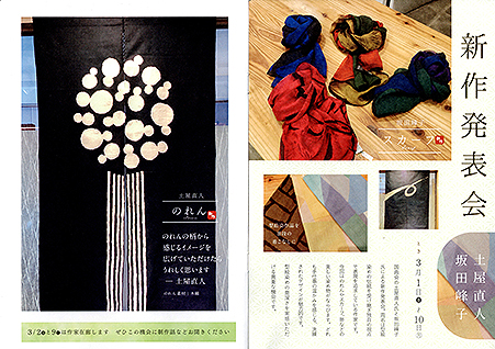 2008年催事リスト 3月12日~18日 浜松遠鉄百貨店7階アートサロン「土屋直人・坂田峰子染色2人展」 5月21日~27日 熊本鶴屋 「土屋直人・坂田峰子染色2人展」 6月24日〜30日 黒崎井筒屋 「坂田峰子染色展」 8月27日〜9月1日 横浜高島屋 「全国工房クラフト展」 9月10日〜16日 京都高島屋 「創作市場・土屋染色工房展」 |